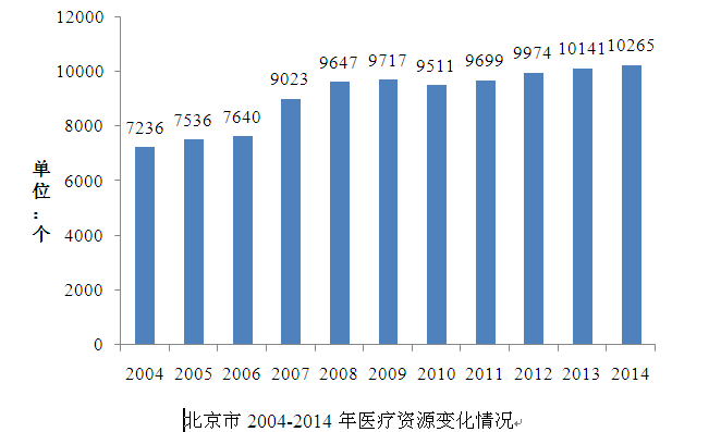 北京是我國醫(yī)療衛(wèi)生資源最為密集的地區(qū)之一。2014年末,全市醫(yī)療衛(wèi)生機(jī)構(gòu)數(shù)達(dá)10265家(包含15家駐京部隊(duì)醫(yī)療機(jī)構(gòu)),其中醫(yī)療機(jī)構(gòu)10107家(含89家三級(jí)醫(yī)療機(jī)構(gòu)、147家二級(jí)醫(yī)療機(jī)構(gòu)以及600家一級(jí)醫(yī)療機(jī)構(gòu)),其他衛(wèi)生機(jī)構(gòu)158家。除擁有為數(shù)眾多的綜合醫(yī)院外,北京有口腔、眼科、腫瘤、心血管等各類??漆t(yī)院,各類醫(yī)院平均治愈率近60%,大多數(shù)專科醫(yī)院病人治愈率更是超過90%,高于全國平均水平。