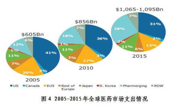 到2015年,美國占國際醫(yī)藥市場支出的份額將從2005年的41%下降到31%,而位于國際醫(yī)藥市場支出份額第五名的歐洲的國家也將從20%下降到13%。同時,17%高增長新興市場將有中國引領(lǐng),到2015年它所占份額將從2005年的12%上升到28%。(數(shù)據(jù)來源:IMS Market Prognosis, Apr 2011)