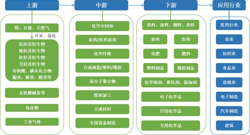 石化產(chǎn)業(yè)鏈上游涉及石油、天然氣、煤、無機(jī)鹽礦等開采,中游涉及基礎(chǔ)化學(xué)原料、化學(xué)中間體、合成纖維、合成橡膠等以及衍生品的生產(chǎn),下游涉及農(nóng)藥、化肥、醫(yī)藥、電子化學(xué)品、化學(xué)助劑、日用化學(xué)品等終端產(chǎn)品制造。