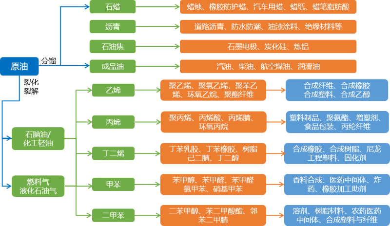 ——石油化工產(chǎn)業(yè)鏈。原油經(jīng)過分餾、熱裂解、催化重整等工藝,生產(chǎn)燃料油、潤滑油、液化石油氣、石油焦碳、石蠟、瀝青等石油產(chǎn)品,及乙烯、丙烯、丁二烯、苯、甲苯、二甲苯為代表的基本化工原料,再合成塑料、纖維、橡膠、樹脂等下游產(chǎn)品。