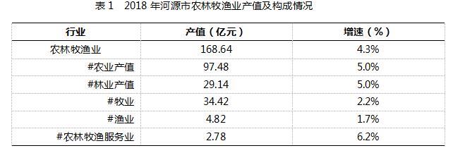 2018年,河源市GDP首破千億元大關(guān),但經(jīng)濟(jì)總量及人均GDP位居廣東省下游水平,經(jīng)濟(jì)增速有所放緩但仍穩(wěn)居全省中上游水平,整體處于工業(yè)化和城市化向中期邁進(jìn)階段。產(chǎn)業(yè)結(jié)構(gòu)逐步合理,服務(wù)業(yè)比重首次突破50%,農(nóng)民人均收入首超全國(guó)平均水平,高質(zhì)量發(fā)展穩(wěn)步推進(jìn),新舊動(dòng)能轉(zhuǎn)換明顯加快。從產(chǎn)業(yè)結(jié)構(gòu)看,第一產(chǎn)業(yè)占據(jù)河源市GDP的10%左右,傳統(tǒng)農(nóng)牧業(yè)仍占據(jù)現(xiàn)代農(nóng)業(yè)主導(dǎo)地位,農(nóng)林牧漁服務(wù)業(yè)成為現(xiàn)代農(nóng)業(yè)發(fā)展亮點(diǎn),但總量規(guī)模仍需亟待提升。從農(nóng)業(yè)發(fā)展載體看,2018年新增4個(gè)省級(jí)現(xiàn)代農(nóng)業(yè)產(chǎn)業(yè)園、5個(gè)省級(jí)農(nóng)業(yè)標(biāo)準(zhǔn)化示范區(qū),燈塔盆地核心區(qū)建設(shè)穩(wěn)步推進(jìn),龍川國(guó)家級(jí)電子商務(wù)進(jìn)農(nóng)村綜合示范縣順利通過(guò)國(guó)家驗(yàn)收,船塘鎮(zhèn)(板栗)、龍窩鎮(zhèn)(茶葉)入選全國(guó)農(nóng)業(yè)產(chǎn)業(yè)強(qiáng)鎮(zhèn)示范建設(shè),農(nóng)業(yè)農(nóng)村產(chǎn)業(yè)發(fā)展載體進(jìn)一步夯實(shí)。農(nóng)村重點(diǎn)領(lǐng)域改革深入推進(jìn),農(nóng)村集體產(chǎn)權(quán)制度改革穩(wěn)步推進(jìn),農(nóng)村土地確權(quán)登記頒證基本完成,農(nóng)村產(chǎn)權(quán)流轉(zhuǎn)管理服務(wù)平臺(tái)和鎮(zhèn)(街)級(jí)平臺(tái)逐步完善,信用村和鄉(xiāng)村金融服務(wù)站實(shí)現(xiàn)行政村全覆蓋。