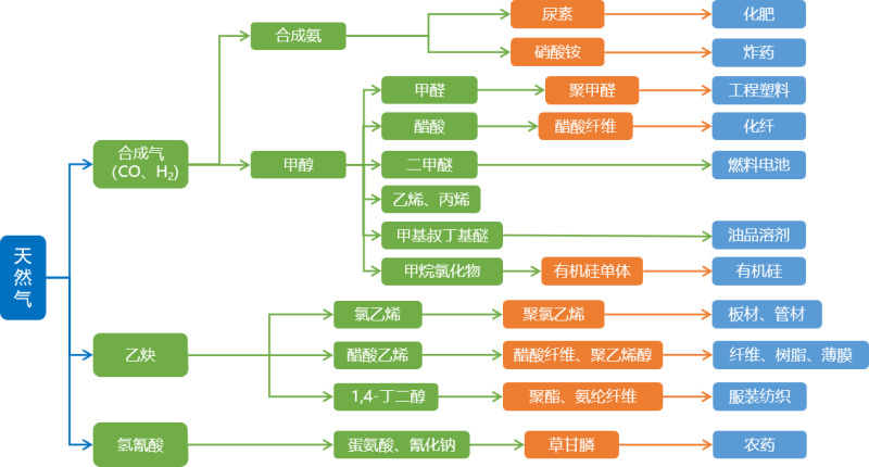 ——天然氣化工產(chǎn)業(yè)鏈。以天然氣為原料,通過凈化分離、裂解、氯化、硫化、脫氫等反應(yīng),生產(chǎn)合成氨、甲醇、乙炔、氫氰酸等基本化工原料,再合成尿素、草甘膦等化肥農(nóng)藥、塑料、纖維、橡膠、樹脂、有機(jī)硅、化學(xué)溶劑等產(chǎn)品。