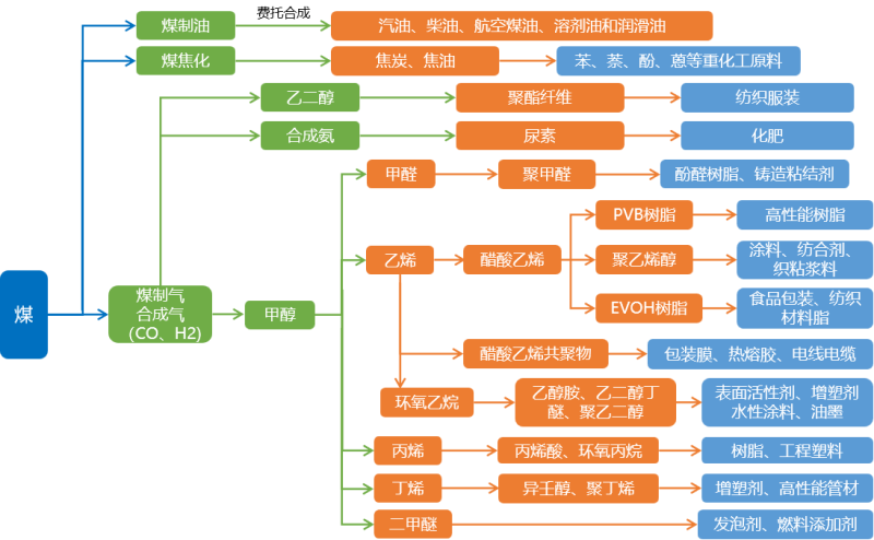 ——現(xiàn)代煤化工產(chǎn)業(yè)鏈。煤化工是以煤為原料,經(jīng)過化學(xué)加工生產(chǎn)多種清潔燃料和基礎(chǔ)化工原料的產(chǎn)業(yè),包括煤制油、煤制天然氣、低階煤分質(zhì)利用、煤制烯烴、煤制乙二醇等煤制化學(xué)品以及煤基新材料。